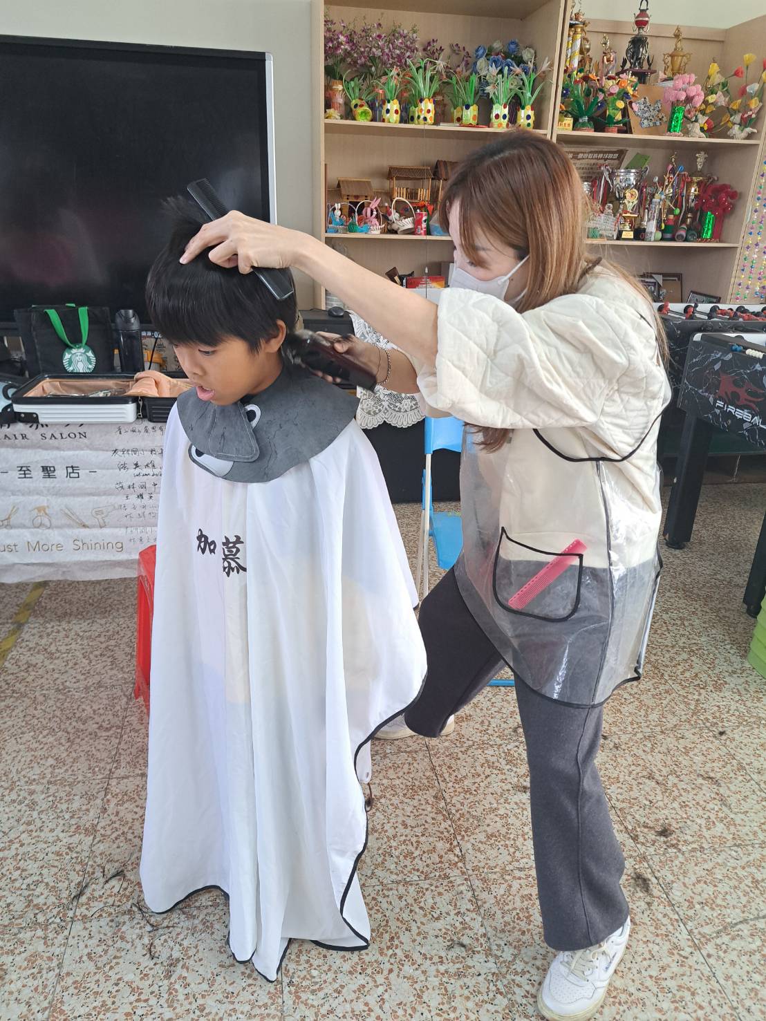 ↑圖說:「加慕秀-至聖店」美髮設計師Kimi Liang領軍6位設計師到場為全校學童義剪(圖片來源:業者提供)