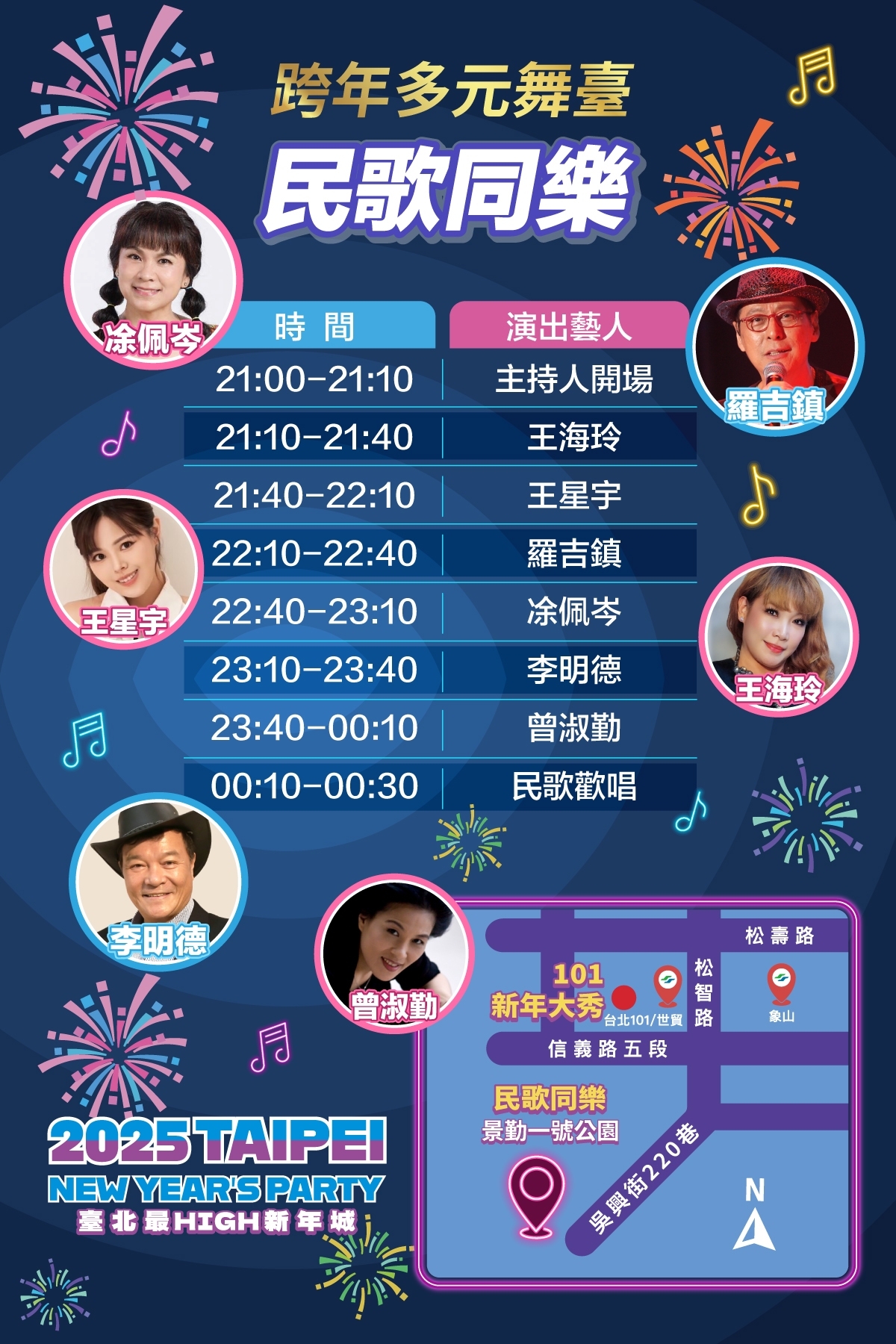 隨著2024尾聲將近,在韓國女團Apink、ENERGY等團體演出後,台北市長蔣萬安、副市長李四川、林奕華、張溫德,台北101董事長賈永婕、奧運金牌選手們、台北市議長戴錫欽及副議長葉林傳等,約在晚間11點50分開始,與現場民眾同步倒數,一同迎接台北101煙火秀以及2025年的到來。最後,還有歌手梁詠琪、樂團八三夭開唱,為跨年晚會帶來完美收尾。