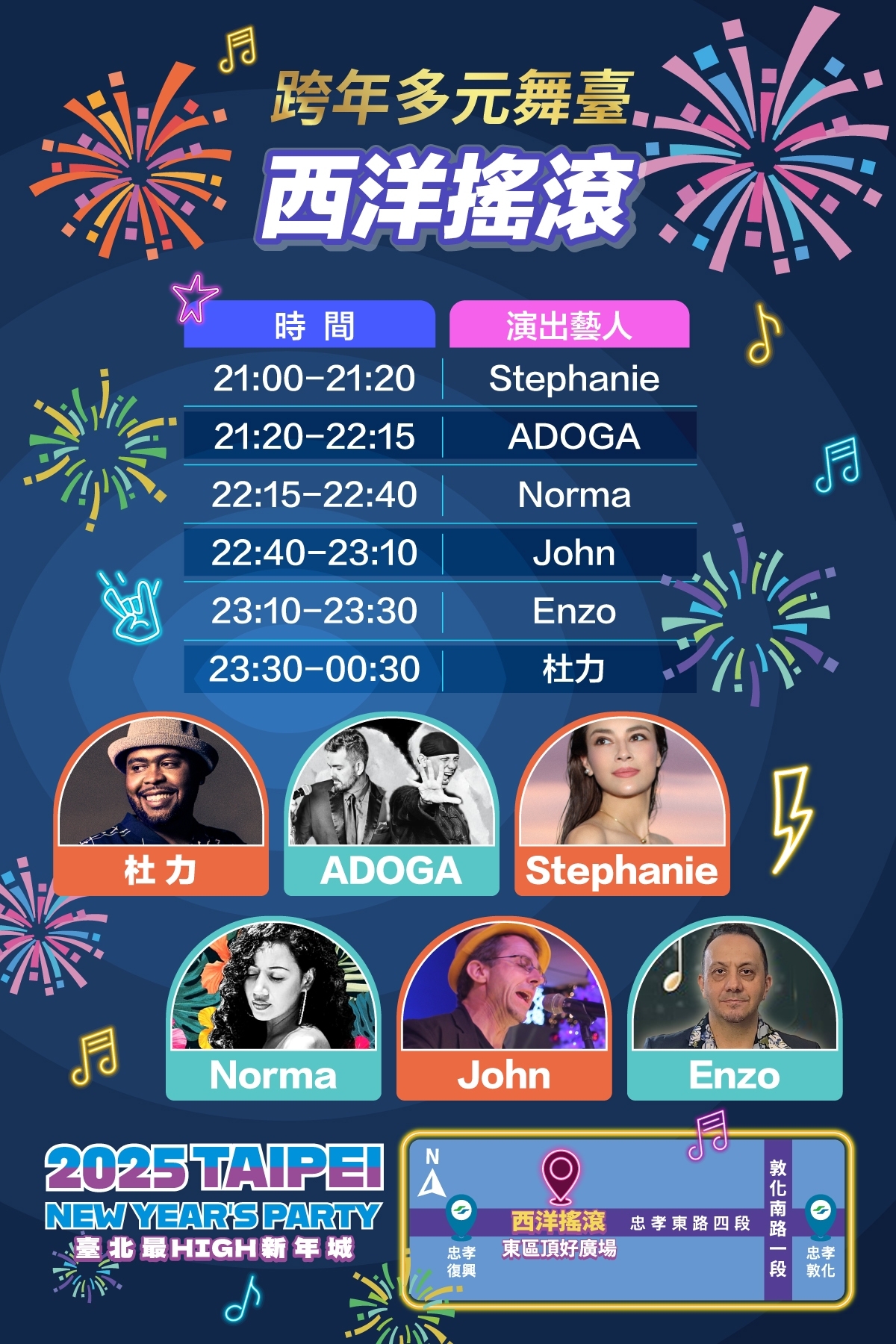 「西洋搖滾舞台」位於東區頂好廣場,則以西洋經典、文青節奏感兩大風格為主題,將由Stephanie、ADOGA、Norma、杜力等結合搖滾樂迷熟悉的經典旋律與現場互動。