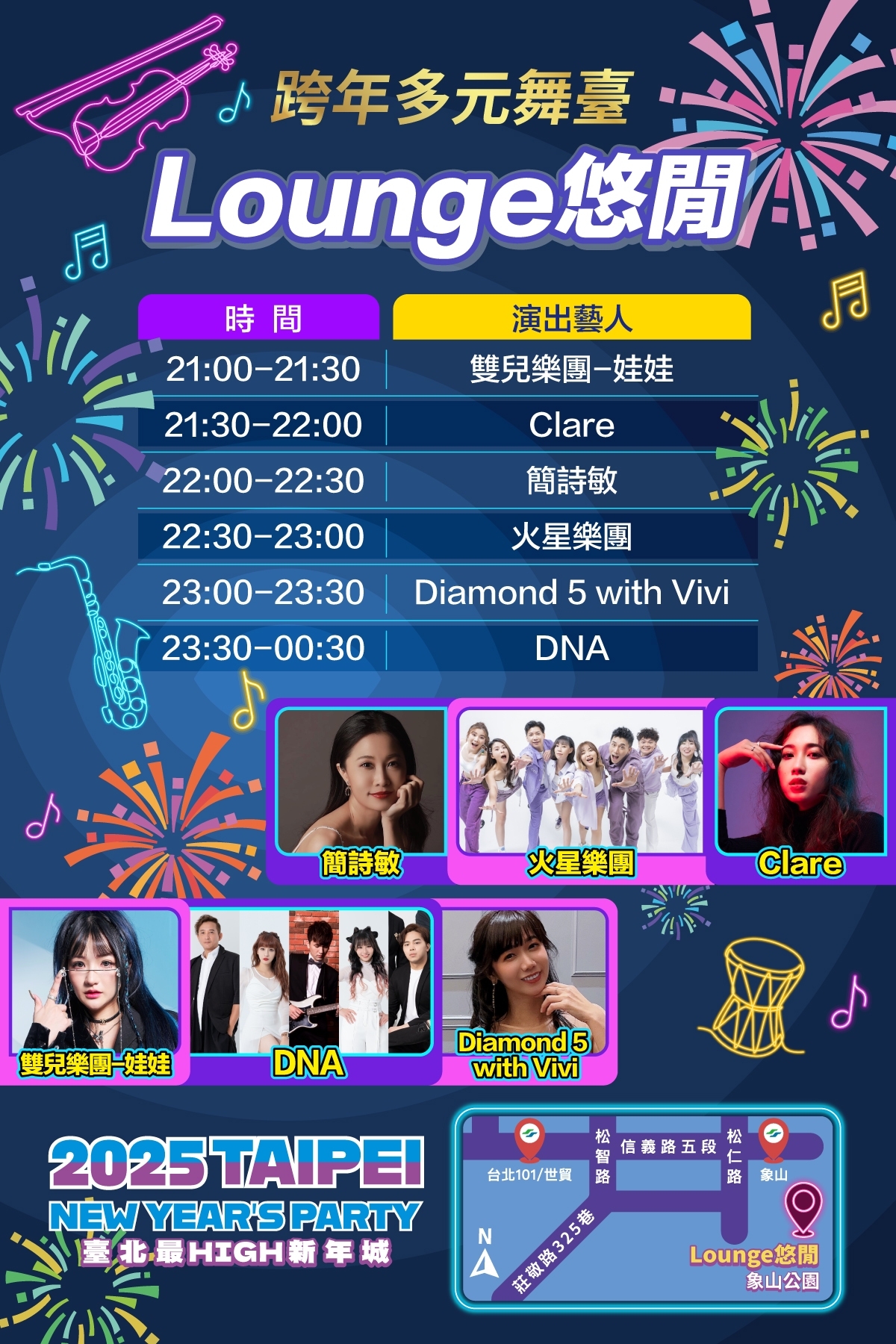 「Lounge悠閒舞台」則在今年全新規劃的象山公園舉行,以輕鬆悠閒風格為主題,安排雙兒樂團-娃娃、簡詩敏、火星樂團等精彩演出,帶來不同的音樂體驗。