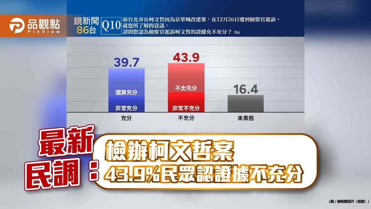 前台灣民眾黨主席柯文哲涉入多案遭檢起訴,牽動國內政局發展,《鏡新聞》近日公布最新民調,內容包括是否認為柯文哲有涉貪、本案證據是否充分、求刑合理度、政黨支持度走勢等,特別有關近期柯文哲多次裁定交保,卻又遭檢方抗告一事,民調結果顯示,有39.7%民眾認為充分、43.9%認為不夠充分。