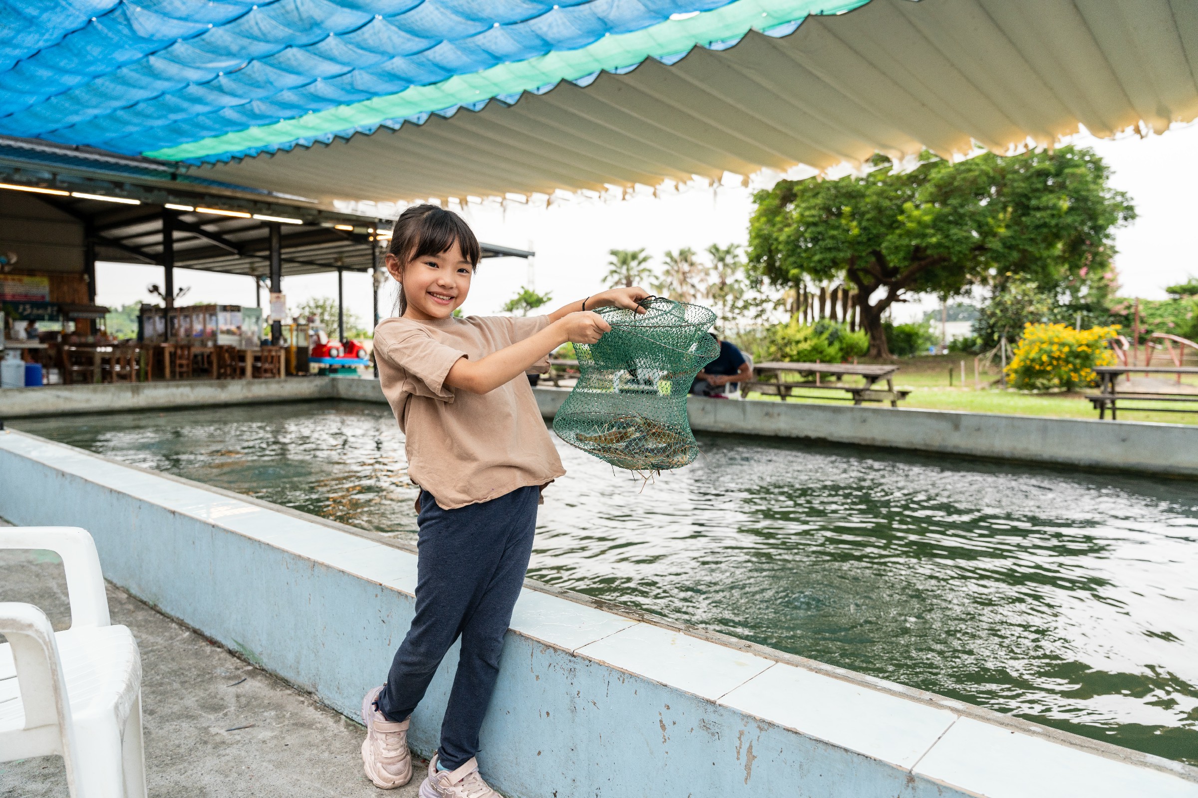 ↑圖說:「巧楓村休閒園區」原為泰國蝦養殖場,如今成為適合家庭聚會的休閒勝地,家長與孩子可以一起釣蝦(圖片來源:嘉義縣文觀局提供)