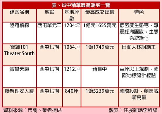 包括台中的陸府、寶輝、聯聚等指標個案,在過去一年均吸引高端客目光,實價登錄都有破億元的交易揭露,且蛋黃區的價格相比蛋白與蛋殼更有抗跌性。