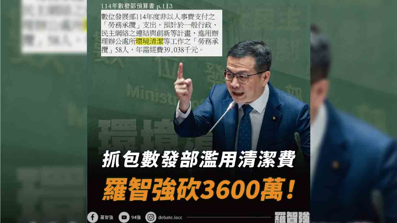 國民黨立委羅智強今日痛批數位發展部濫用環境清潔預算,並宣布將在二階段預算審查時提案刪減3600萬元。此舉源於數發部日前針對3903.8萬元環境清潔勞務承攬費的爭議發布澄清說明,卻意外暴露更大問題。