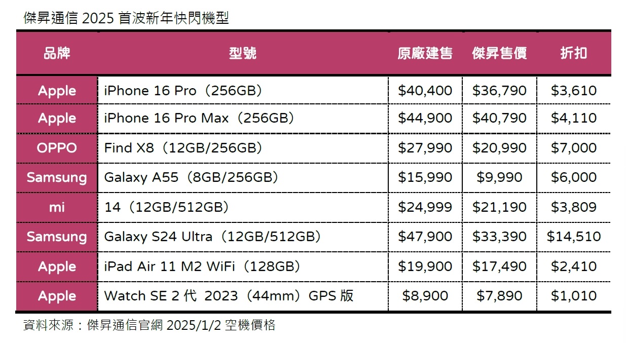 另外,OPPO Find X8新年首波快閃直接折扣7000元,想換5G手機的民眾不妨好好把握;小米14原廠建議售價2萬4999元,傑昇再降3809元,只要2萬1190元,就可入手。