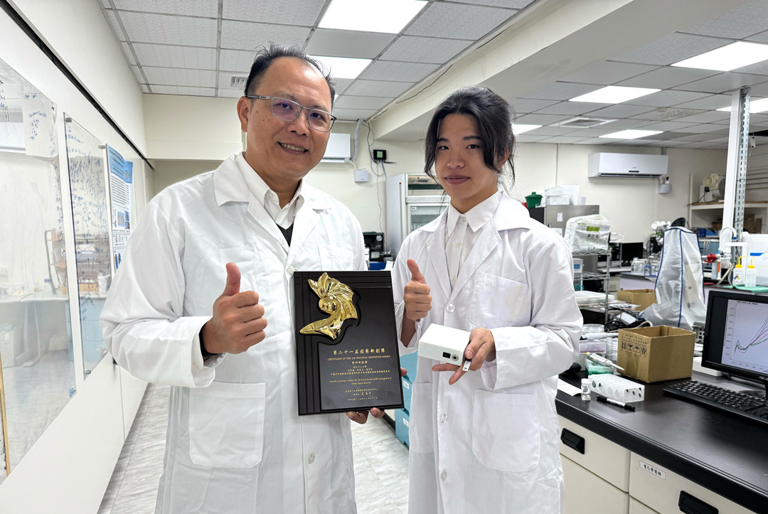 圖說:莊承鑫(左)團隊研發「可攜式肌酸酐檢測儀」,榮獲第21屆「國家新創獎」學研新創獎肯定。(圖片來源:中山大學提供)