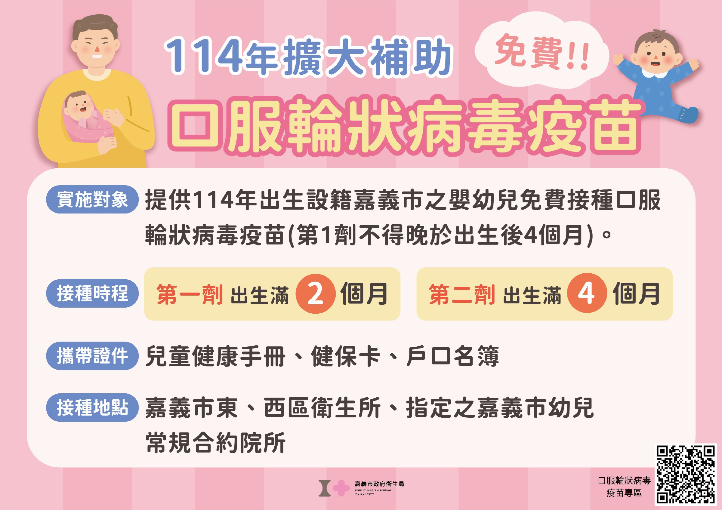 嘉義市衛生局局長廖育瑋進一步指出,輪狀病毒是高度傳染的腸胃道疾病,對嬰幼兒健康威脅不容小覷。透過免費疫苗接種計畫,不僅可有效提升嬰幼兒的免疫保護力,更能減輕家長的經濟負擔。2劑型口服輪狀病毒疫苗建議接種時程為嬰兒出生滿2個月及4個月內完成,家長可攜帶兒童健康手冊、健保卡及戶口名簿,前往嘉義市東、西區衛生所或21家指定合約院所接種,並建議與公費疫苗(如五合一疫苗及肺炎鏈球菌疫苗)同步接種,方便又高效。