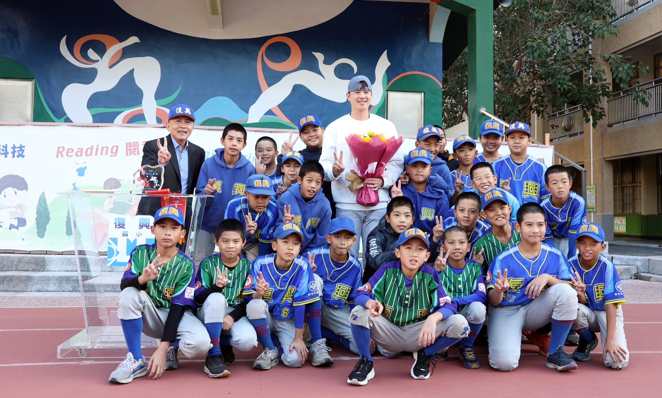 整個歡迎儀式在熱情洋溢的氛圍中展開,少棒隊的學弟們用棒球戰舞與獻花表達敬意,而校方則特別為黃子鵬頒發專屬設計的紀念獎座與彩帶,場面溫馨感人。校長蔡進元表示,黃子鵬在12強賽中的精彩表現不僅為臺灣贏得冠軍,也激勵了無數人。他的成功,體現了堅持與努力的價值,更為復興國小增添無比榮耀。