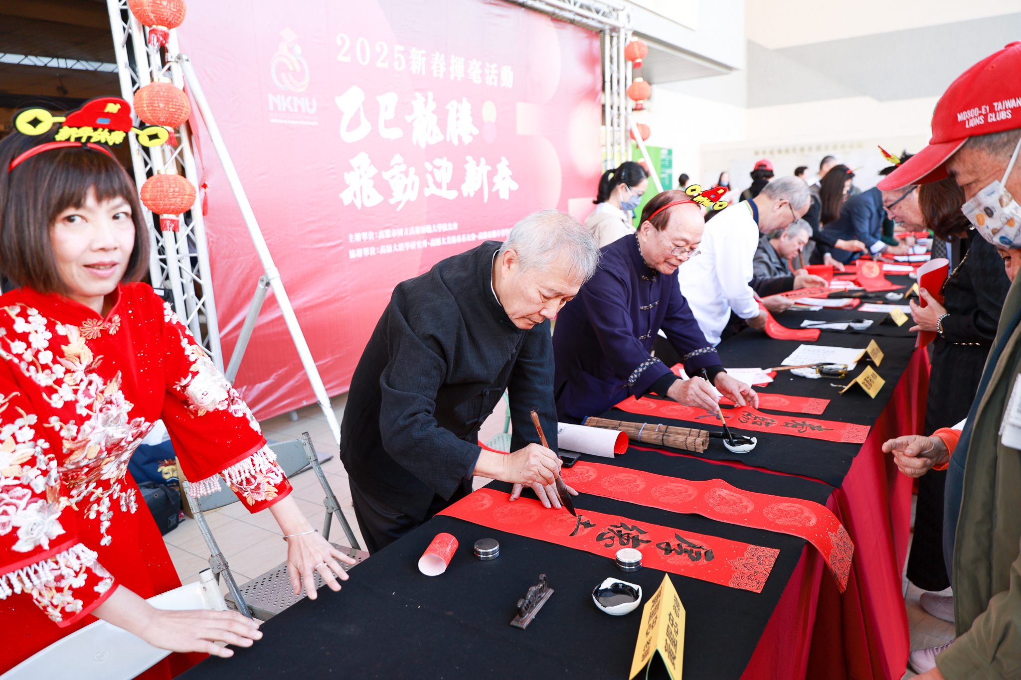 國立高雄師師範大學高雄市校友會攜手高師大經學研究所、高師大美術系友會、高雄市蘭亭書學會,6日在高師大活動中心入口平台舉辦「乙巳龍螣飛動迎新春」揮毫活動,邀請校長王政彥與校友會理事長黃澤華等人共同主持,以響徹雲霄的敲鑼儀式揭開序幕,祝福高師大校運昌隆、新的一年平安順利好運到。