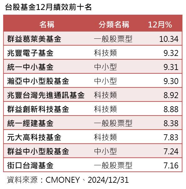 除了高含積ETF績效亮眼,不少台股基金也是水漲船高,檢視去(2024)年12月大盤上漲3.47%,統計共有114檔近八成台股基金打敗大盤,其中,群益葛萊美基金漲10.34%奪冠,其他包括群益創新科技、群益中小型股、兆豐電子、統一中小、瀚亞中小型股、兆豐台灣先進通訊、統一經建、元大高科技、街口台灣也都有7%以上的好表現。