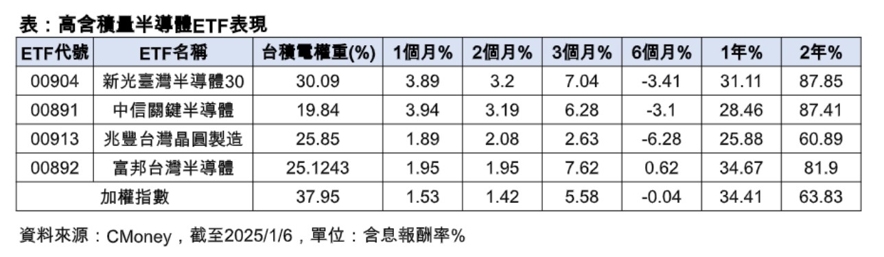 00904持有台積電權重30.09%,近1個月含息漲幅3.89%;中信關鍵半導體ETF(00891)漲3.94%,其他半導體ETF近1個月含息表現也漲逾1%以上。