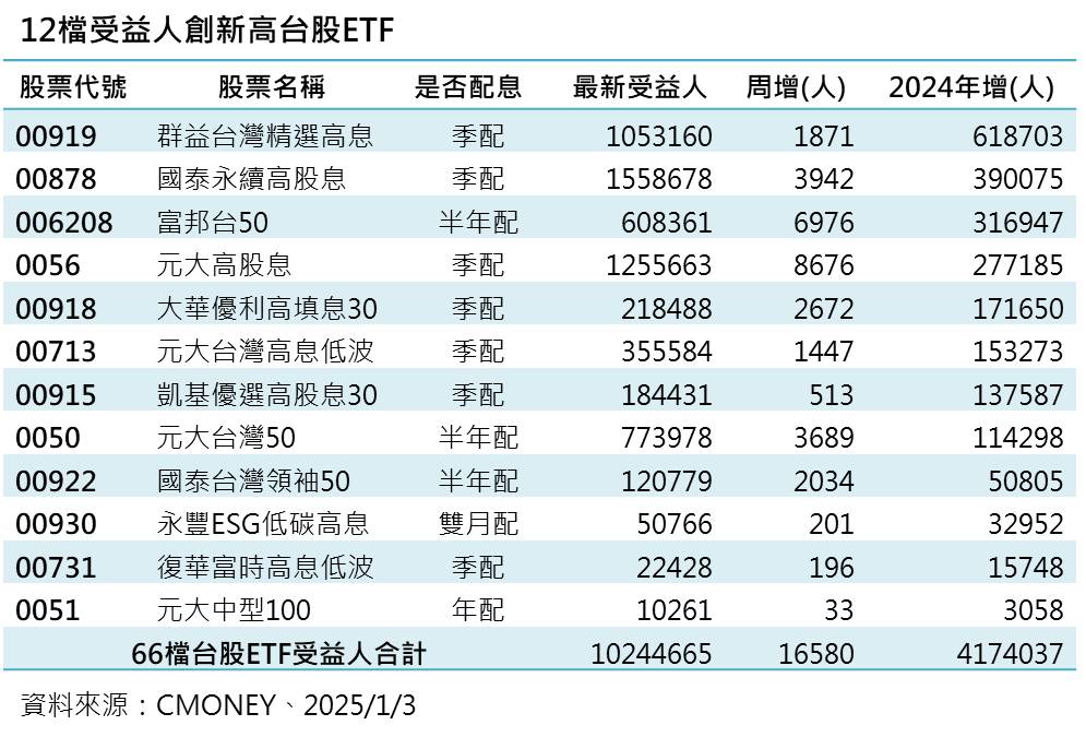 綜觀66檔台股ETF市況,目前仍是強強滾,有12檔受益人數創下新高,其中,群益精選台灣高息(00919)去年大增61.8萬人,增加數居冠;其次是國泰永續高股息(00878)增加39萬餘人,以及富邦台50(006208)增加31萬餘人;前面提到的0056,去年受益人也增加27萬多人,增加數排名第四。