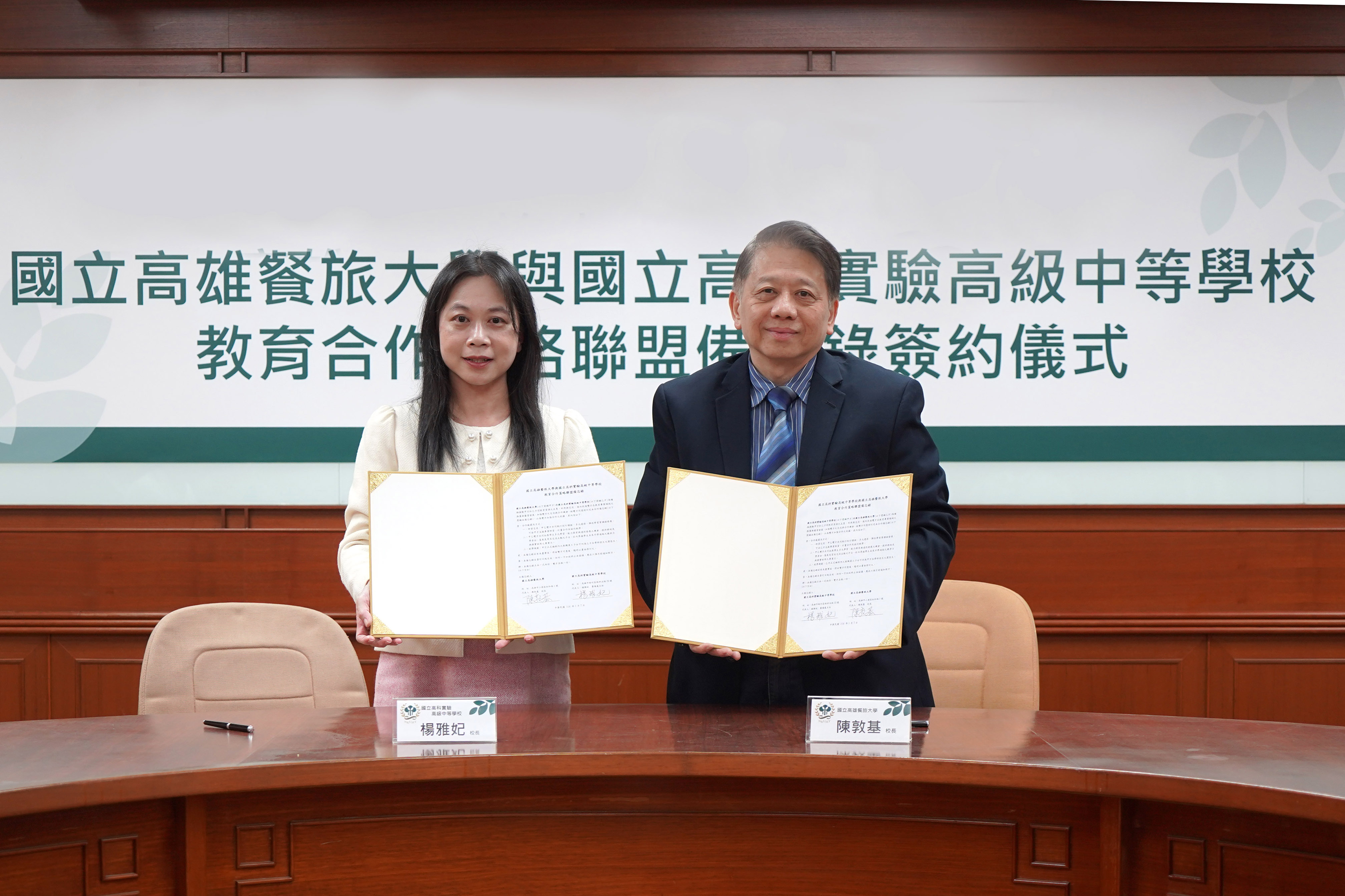 ↑圖說:高餐大校長陳敦基與高科實中校長楊雅妃簽訂MOU(圖片來源:國立高雄餐旅大學提供)