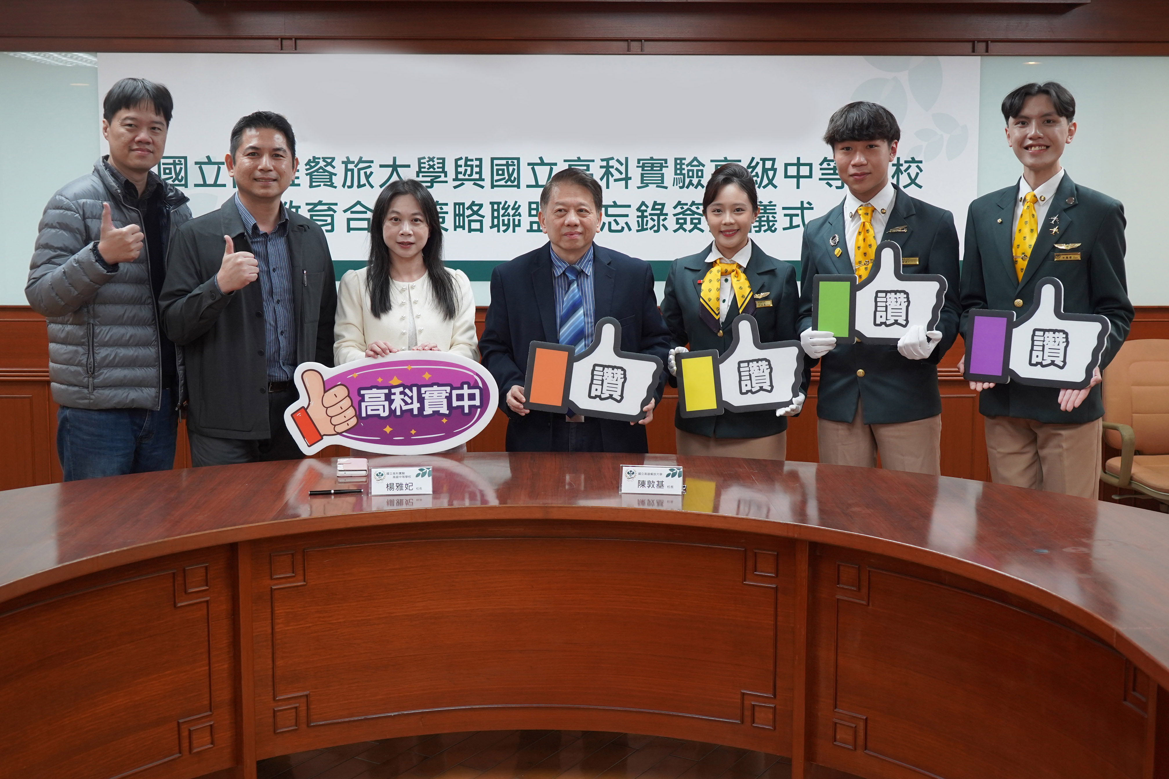 簽約儀式於高餐大舉行,校長陳敦基表示,隨著南部半導體S廊帶的快速發展,科學園區帶動的產業供應鏈正催生出多元的生活與教育需求。高餐大秉持「教育即生活」的理念,將結合高科實中的雙語教學專業,培養學生國際禮儀、行銷策展、職場實習、服務利他等軟實力,並融入美學品味的「新食力」教育,幫助學生透過五感的開放式學習,累積品格、品味與品質兼備的能力,迎接全球化競爭的挑戰。