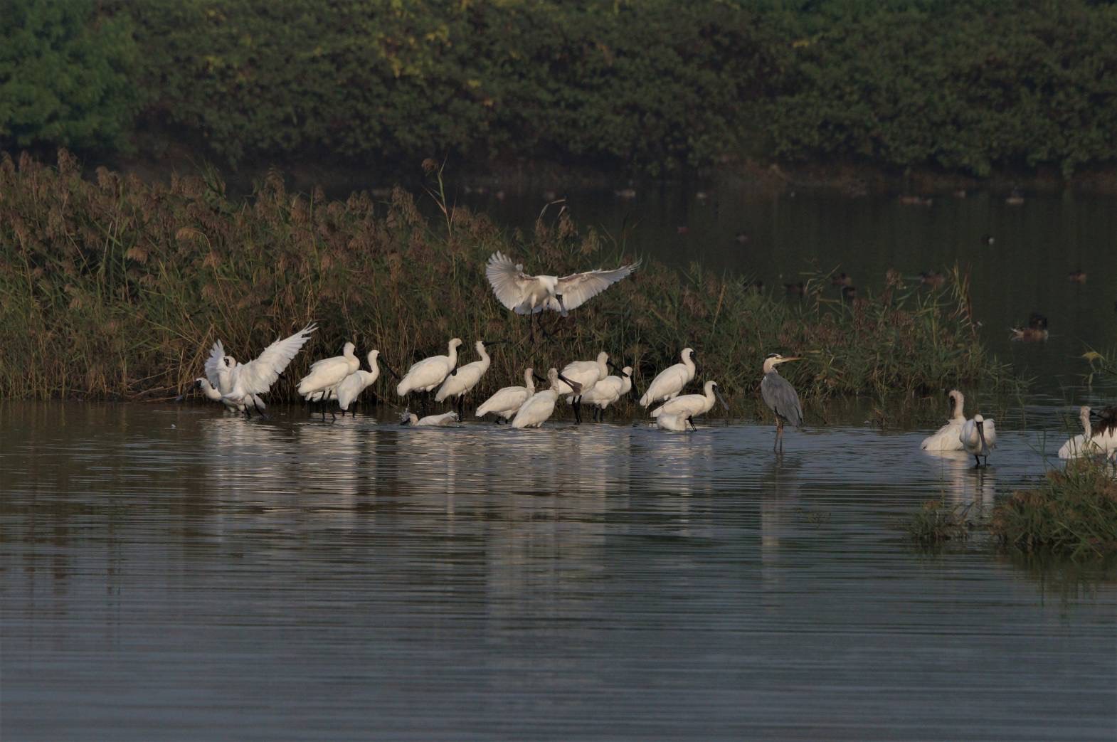 ↑圖說:濕地上黑琵及蒼鷺等鳥類(圖片來源:臺南市農業局提供)