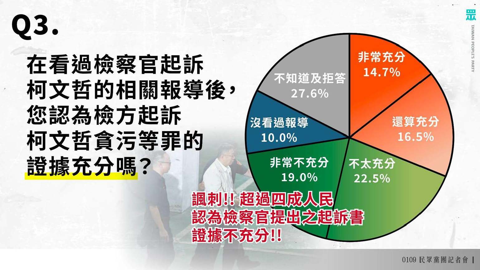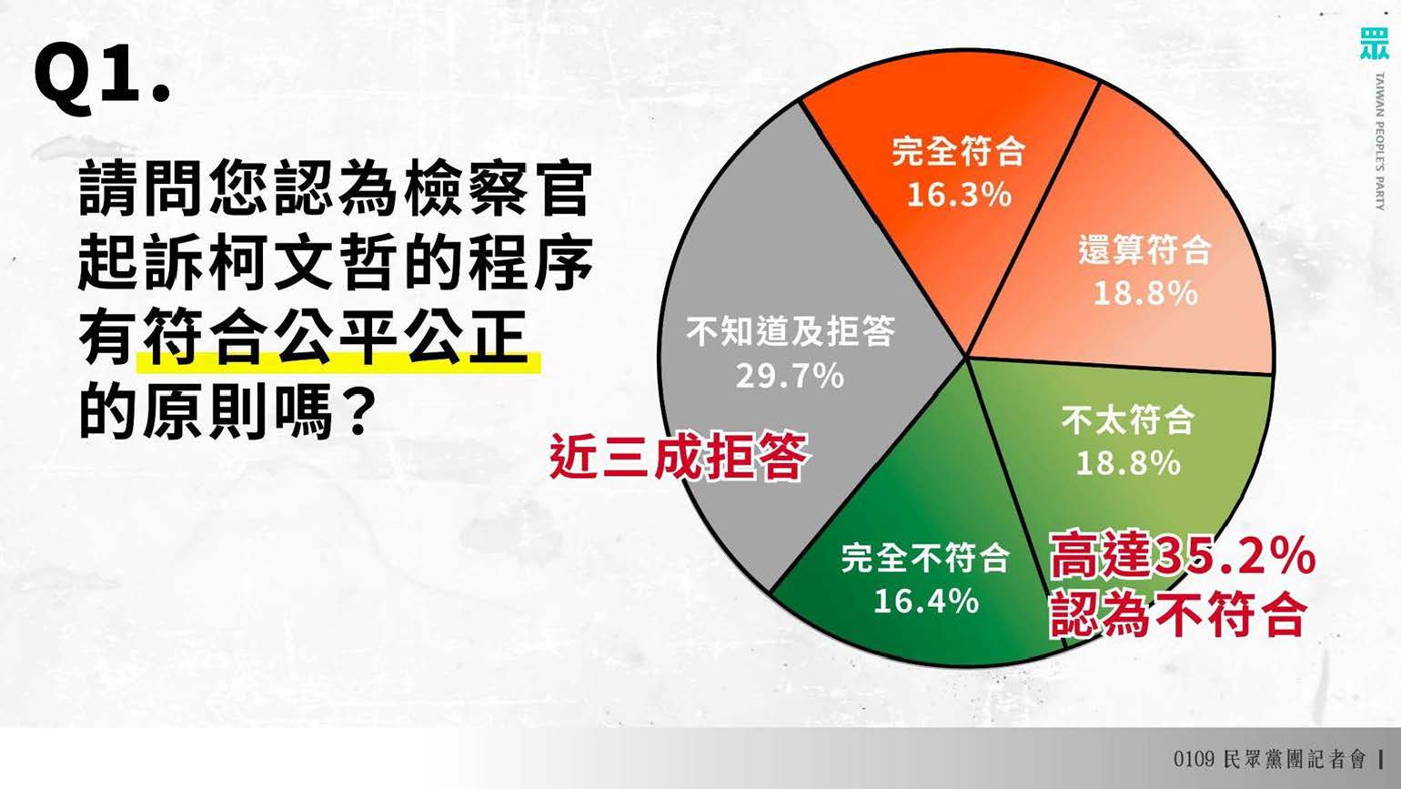 民調顯示,35%受訪者認為北檢起訴柯文哲不公平,其中30-39歲年輕選民更高達5成。在教育程度方面,研究所以上學歷者超過4成認為程序不公。另有超過4成民眾認為檢方未遵守偵查不公開原則,20-39歲年輕族群更達5成。