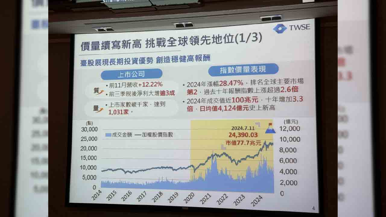 林修銘是在證交所新春記者會發表上述看法,他首先回顧台股去年寫下多項里程碑,包括上市公司掛牌家數成長至1031家,台股全年漲幅28.47%,僅次於Nasdaq,十年來加權報酬指數更上漲超過2.6倍,近五年平均報酬約18%,為股民帶來豐厚報酬。