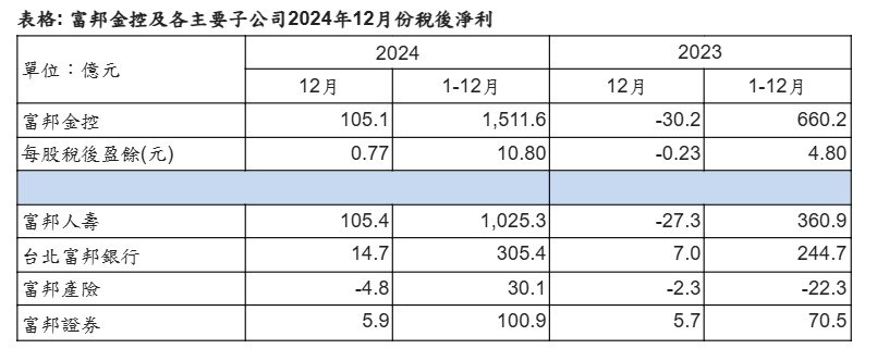 子公司部分,富邦人壽、台北富邦銀行、富邦證券2024年獲利亦皆創下歷史新高紀錄;單月來看,富邦人壽、台北富邦銀行12月稅後淨利同樣改寫歷史新高。