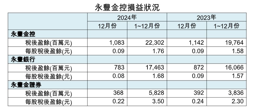 永豐金2024年12月自結單月稅後盈餘10.83億元,累計全年稅後盈餘223.02億元,稅後EPS為1.76元,再創歷史新高。其中主要子公司永豐銀行稅後盈餘174.63億元,稅後EPS為1.68元;永豐金證券稅後盈餘58.28億,稅後EPS為3.5元。