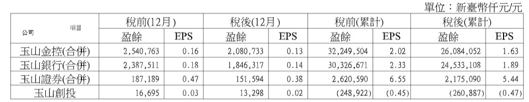 玉山金2024年12月自結稅後盈餘20.8億元,累計全年稅後盈餘260.8億元,年增19.87%,創歷年同期最高,EPS為1.63元。主要子公司玉山銀行累計稅後盈餘245.3億元,年增25.19%;玉山證券21.8億元,年增68.83%;玉山創投-2.6億元。