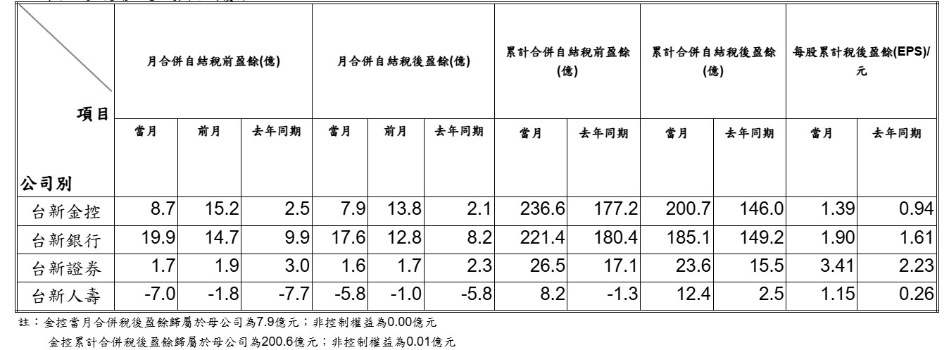 台新金2024年12月自結稅後淨利7.9億元,全年累計稅後淨利200.6億元,每股稅後淨利(EPS)1.39元。子公司台新銀行全年累計稅後淨利185.1億元,創歷史新高,年成長24%,每股稅後淨利(EPS)1.9元;子公司台新證券全年累計稅後淨利23.6億元,每股稅後淨利(EPS)3.41元,主因是證券市場交易熱絡,成交量增加,帶動經紀手續費收入增加。