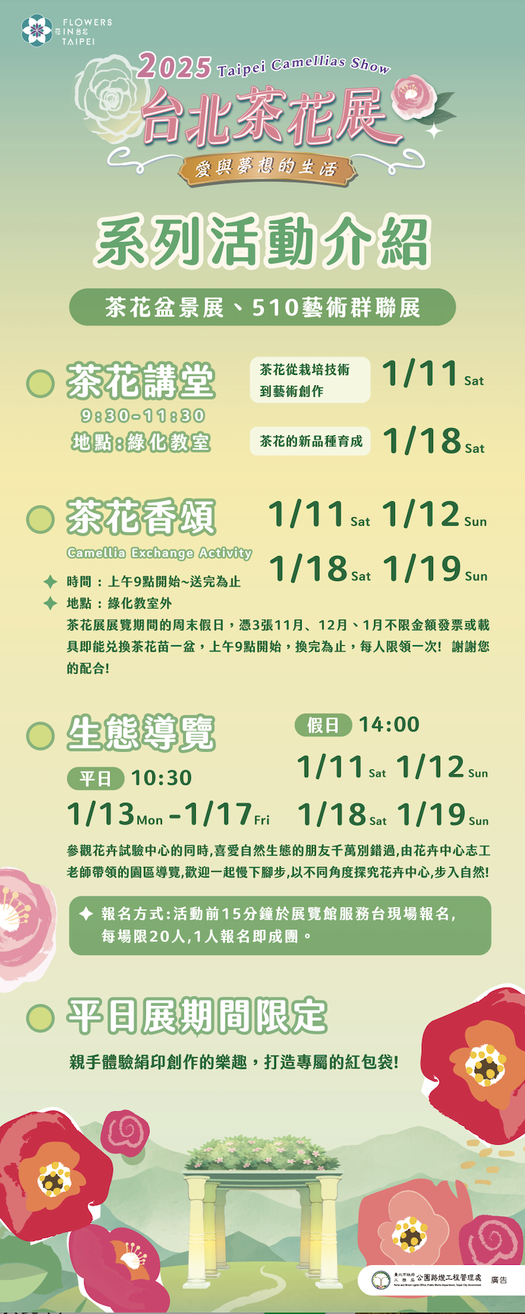 花卉試驗中心於每日上午8時即可入場,17時閉園,室內展場則為上午9時開放,16時停止入場。1月11日與18日將舉辦茶花講堂,特邀專家講授茶花的栽培技術與育種方法,有興趣的朋友可至公園處官網/業務資訊/園藝小學堂報名。