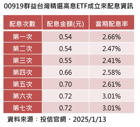 00919採每季配息(3、6、9、12月),成立以來歷次配息金額分別為0.54、0.54、0.55、0.66、0.7、0.72、0.72元,配息政策偏向穩定階梯式向上,是去年不含新成立ETF中,受益人數增加最多的ETF,總受益人數突破百萬,成為第3檔百萬國民ETF。