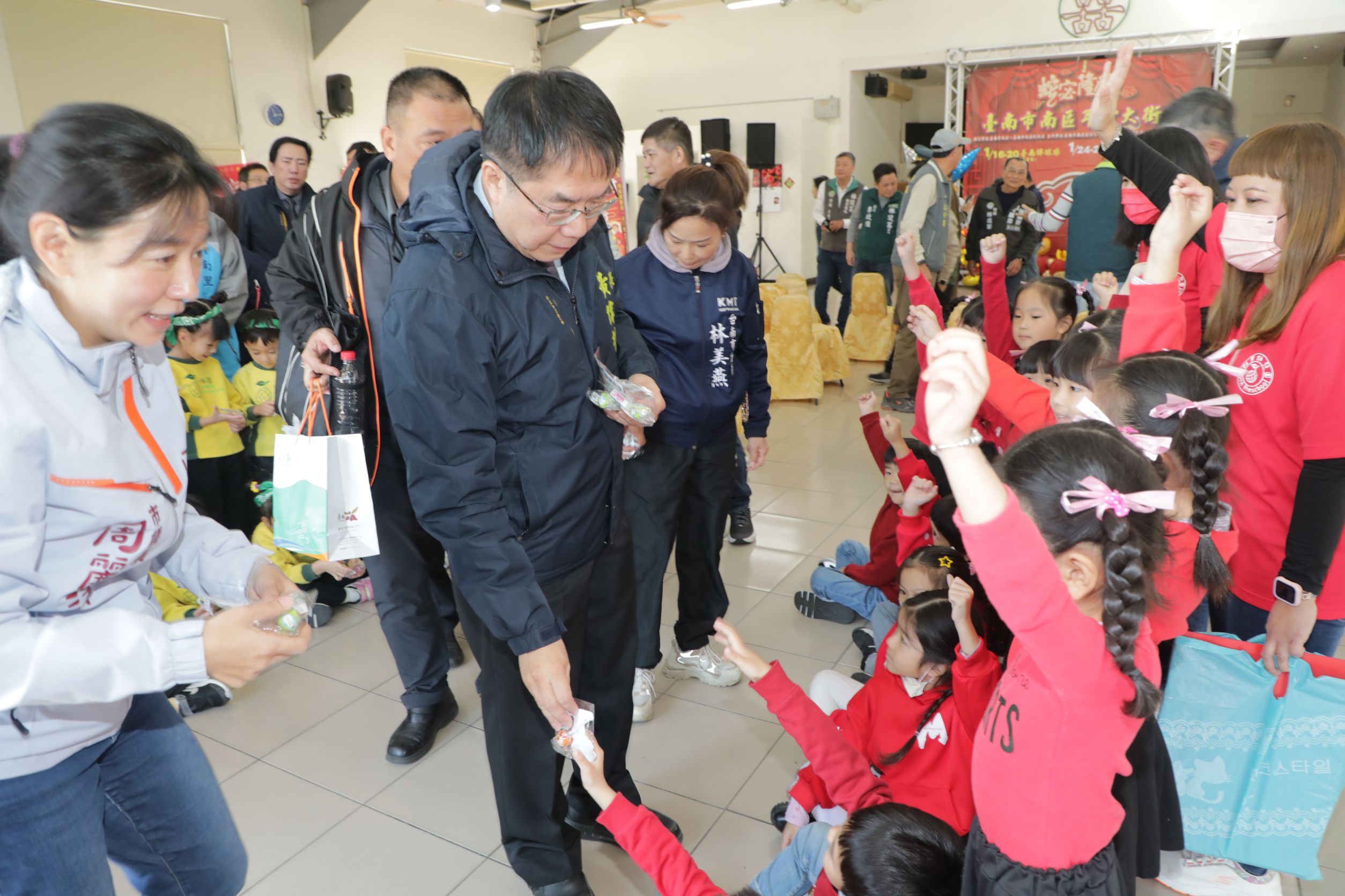 ↑圖說:黃偉哲贈送小禮品給現場小朋友。(圖片來源:臺南市政府提供)