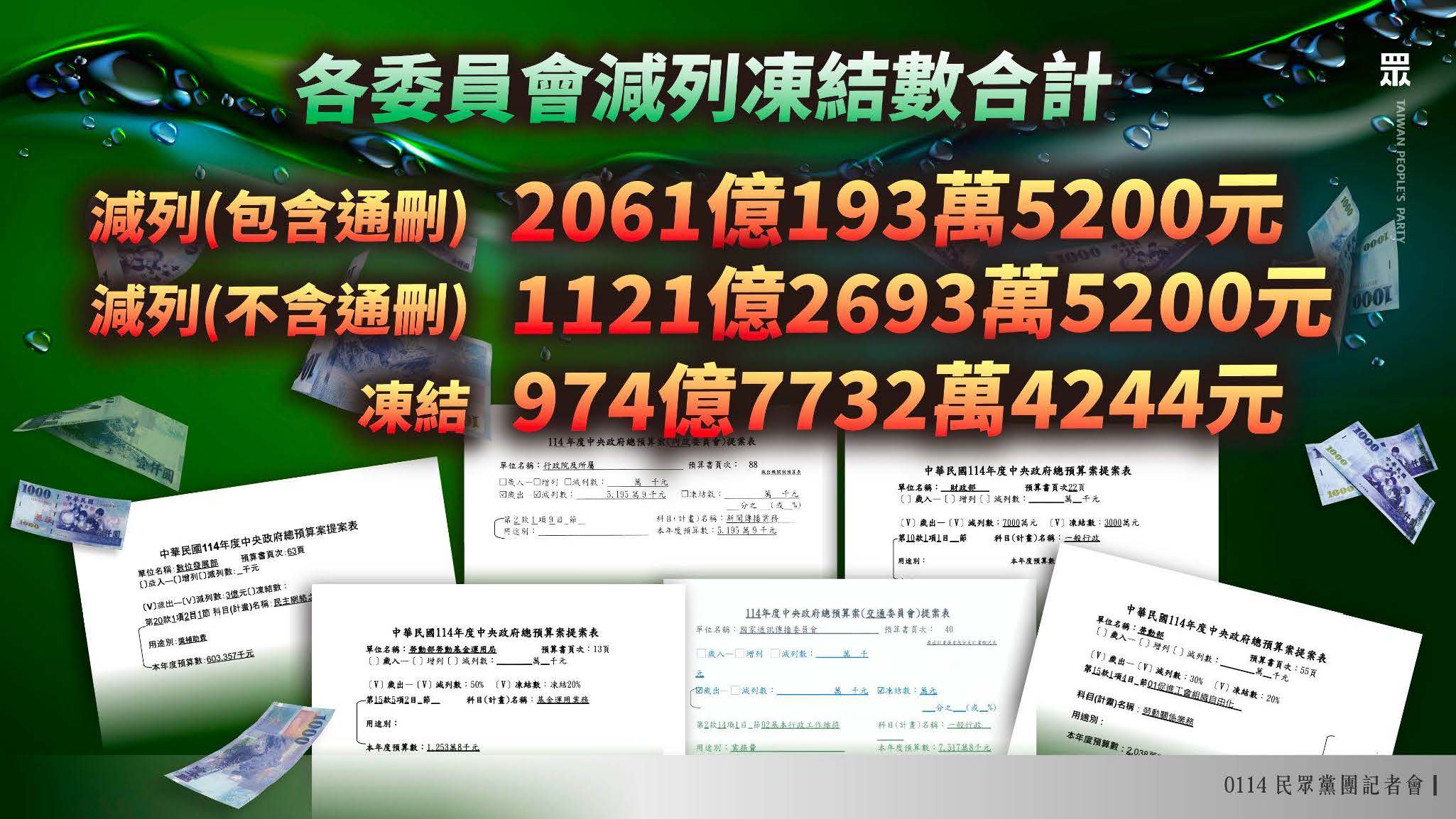 民眾黨黨團今(14)日召開記者會,針對114年度中央政府總預算案提出刪減案,包含通刪在內共計刪減2061億1935萬餘元,凍結974億7732萬餘元,重點包括台電、內政部、文化部等單位預算。