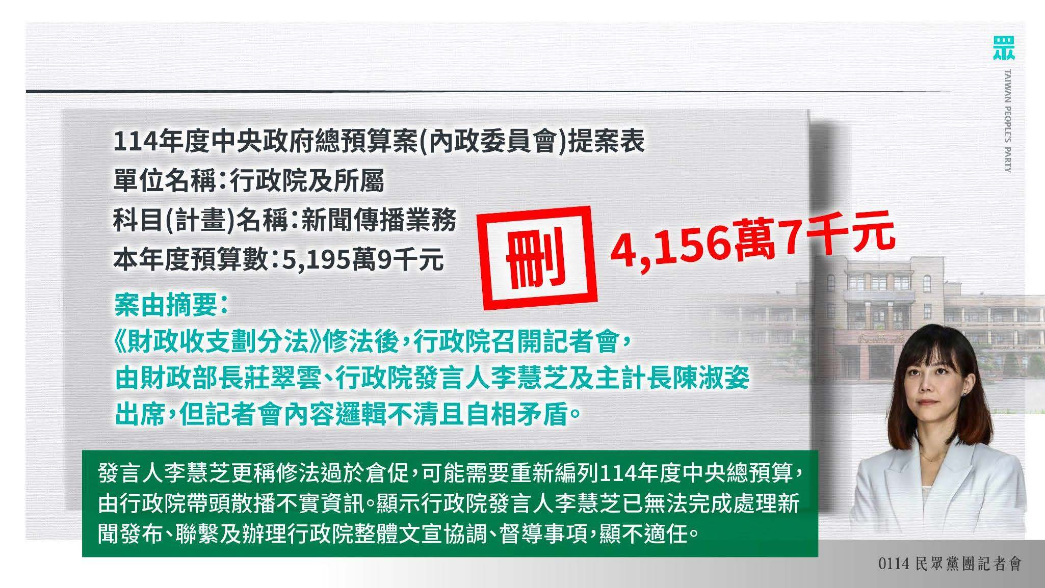 在行政院預算方面,由於卓榮泰就任以來「政策荒腔走板、激化社會對立」,加上發言人李慧芝對財政收支劃分法修法過程「遷延不清且自相矛盾」,民眾黨提案刪減新聞傳播業務4156萬7千元並凍結10%。