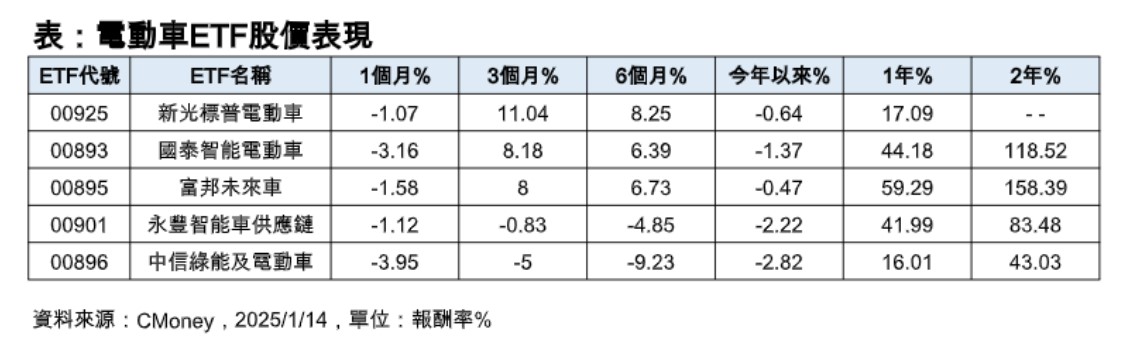 劉恆誌建議,2025年想佈局電動車主題式投資,除直接買特斯拉股票外,最簡單的方法是透過電動車ETF作更廣泛的佈局,可以鎖定股價不到20元、處於相對低價的特斯拉概念ETF,包括新光標普電動車ETF(00925)等相關電動車ETF,採被動投資更省心省力。