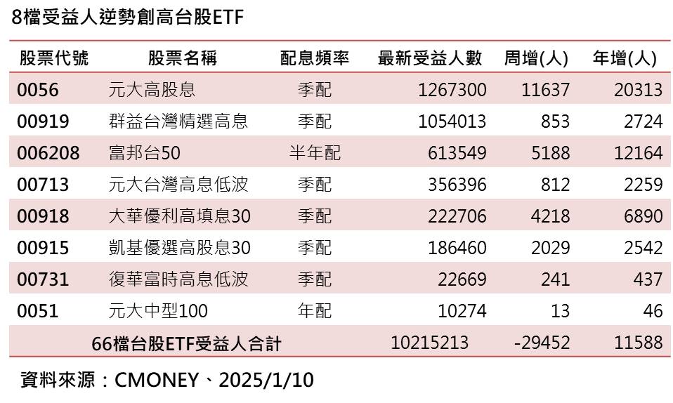 若從受益人數來觀察,1月10日最新統計資料顯示,國內66檔台股ETF受益人近一周減少2.9萬人,其中僅17檔,人數仍增加,其中,包括00919群益台灣精選高息、0056元大高股息、006208富邦台50、00731復華富時高息低波、00713元大台灣高息低波、00918大華優利高填息30、00915凱基優選高股息30、0051元大中型100,一共8檔逆勢創下新高。
