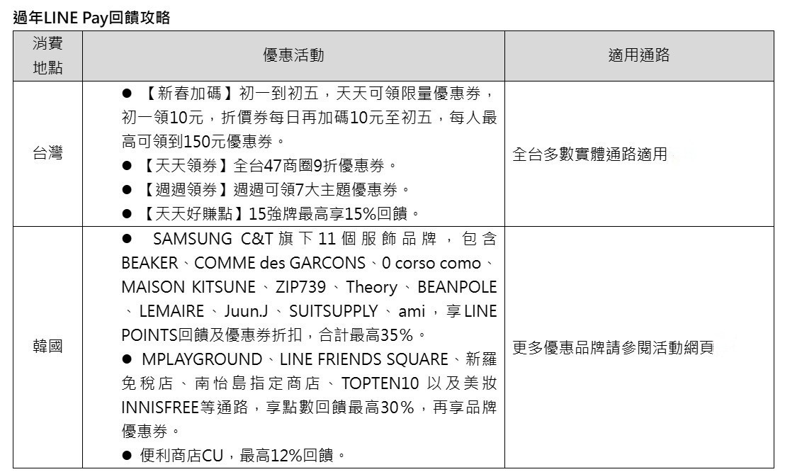 此外,SAMSUNG C&T旗下11個服飾品牌,則享最高20%點數回饋及最高15%滿額折扣優惠券;在韓國最大的連鎖便利商店CU使用LINE Pay消費,也有最高12%點數回饋,優惠至1月31日止。