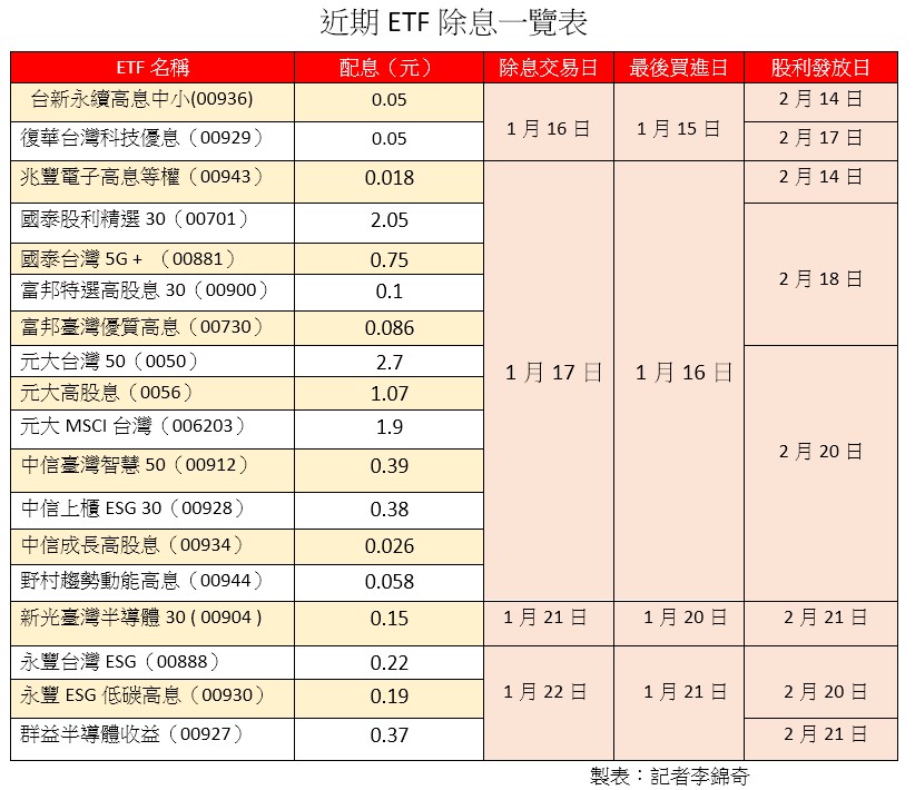 緊接著,17日是本月除息旺日,一共有12檔要登場,包括兆豐電子高息等權(00943),要配發0.018元,2月14日就可入帳。