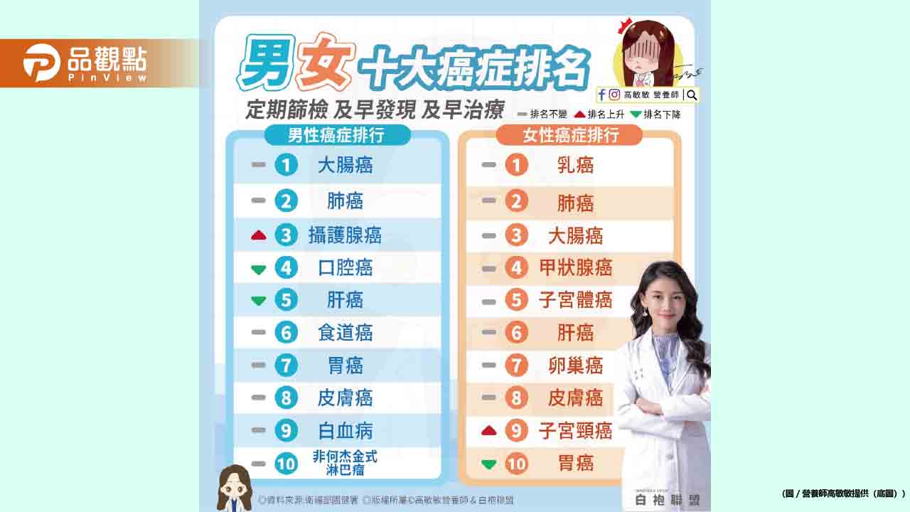 癌症排行反映了環境、飲食及生活方式的變化,營養師也要提醒大家,若有查覺身體異常,就要趕快安排就醫診治,每2-3年安排一次篩檢,有助於早期發現和預防,總之健康的生活方式是預防癌症的關鍵,從今天開始均衡飲食、規律運動並定期篩檢,都是對自己最好的投資,早期發現、早期治療,不僅能減少疾病的威脅,更能提升生活品質,讓我們一起努力為健康把關。
