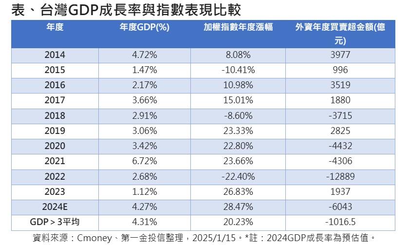 第一金投信表示,統計自2014年以來,台灣共有6次GDP增幅超過3%以上,即便外資在這6年,平均每年賣超台股1016.5億,但台股這6年的平均漲幅仍高達20%,上漲機率100%。依目前各權威機構預測,今年台灣經濟年增率坐三望四,若國際無發生經濟重大變數,致使基本面揚升趨勢被扭轉,當台股跌落半年線附近,即可分批進場。