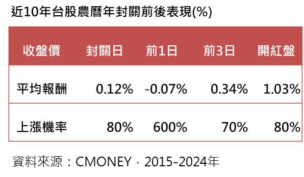 群益投信統計台股近十年封關日表現,當天上漲機率達八成,可能因為封關在即,觀望氣氛濃厚,所以當日平均漲幅僅0.12%;之後,開紅盤機率也是八成,開紅盤當天平均漲幅達1.03%,顯示出年後資金歸隊意願提升,紅包行情可期。
