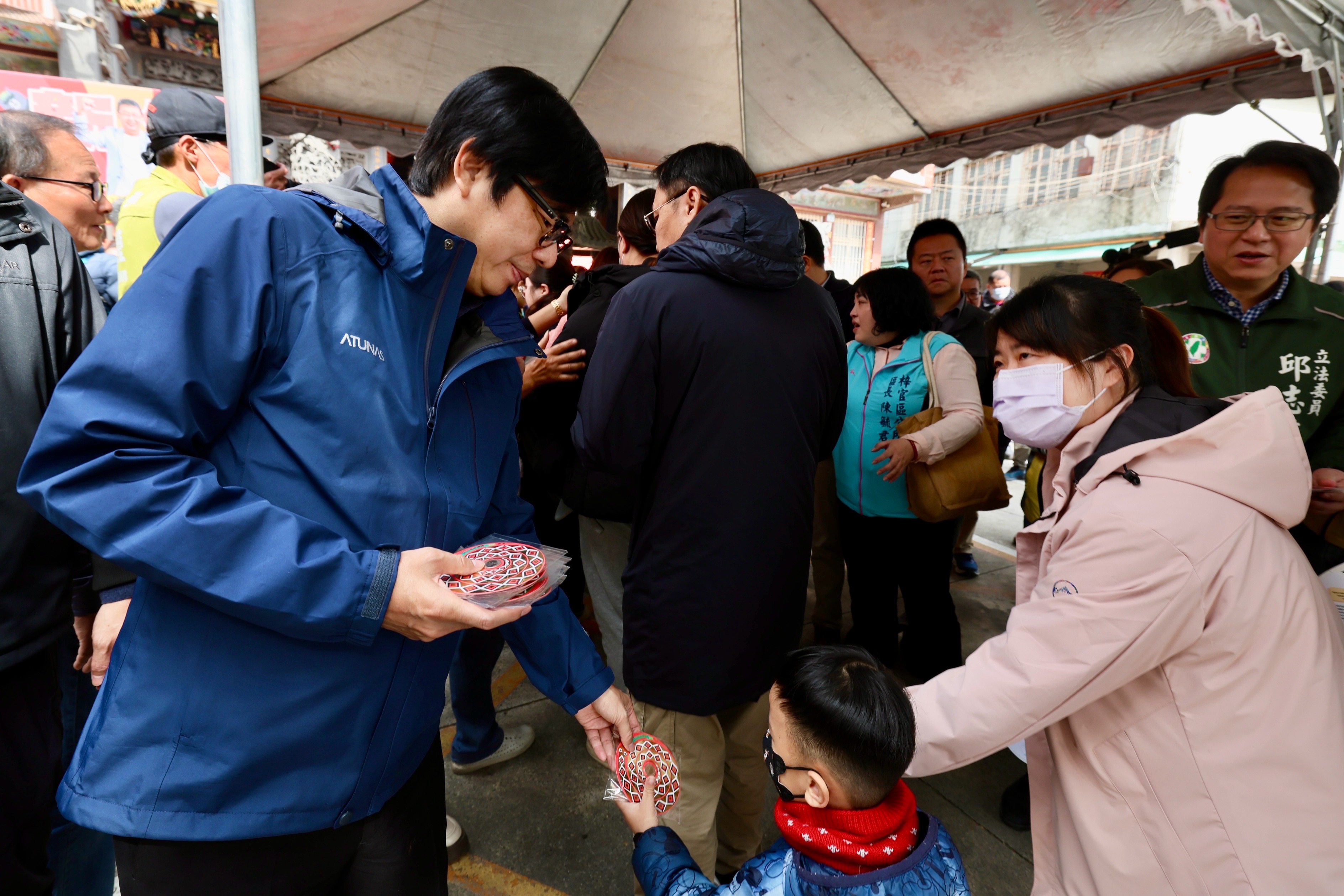 陳其邁隨後前往永安宮、彌陀彌壽宮及梓官城隍廟,多位市議員也一同到場。在廟方陪同下,他虔誠獻花、獻果並上香,祈願新的一年風調雨順、國泰民安。上午氣溫偏涼,但無法澆熄民眾熱情,大家扶老攜幼,牽著家中最寶貝的寵物,在廟前廣場井然有序地排隊,開心地從市長手中接過「蛇來運轉」新年小紅包,也在一旁領取書法名家題字書寫的「運開時泰」春聯,期盼來年好運臨門,現場洋溢喜迎新春的熱鬧氛圍。