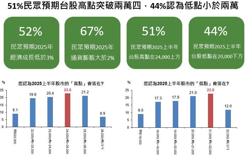 ●52%民眾預期2025年經濟成長率低於3%,67%民眾預期通膨高於2%: