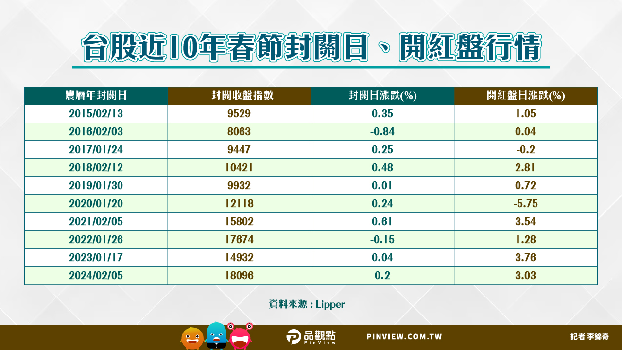 台股農曆龍年封關倒數,明天就是封關日,統計近十年,台股封關日、年後開紅盤日,都是8次上漲、2次下跌,上漲機率達8成。今年將挑戰封關日連3漲,年後開紅盤日連5紅記錄。