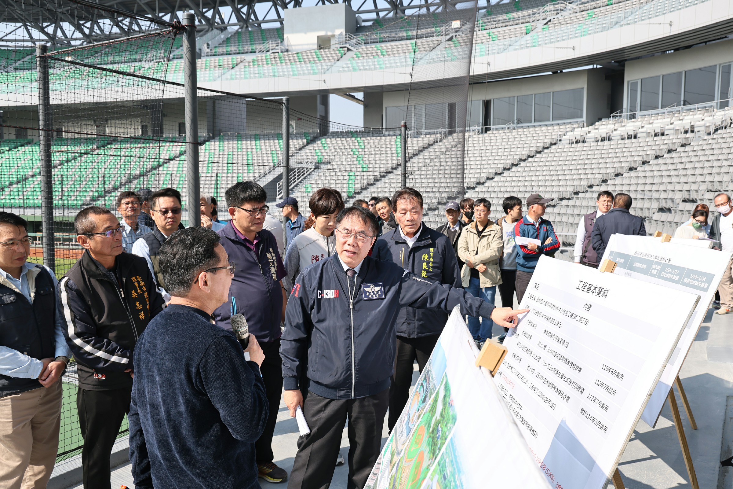 ↑圖說:黃偉哲視察亞太國際棒球訓練中心成棒主球場。(圖片來源:臺南市工務局提供)