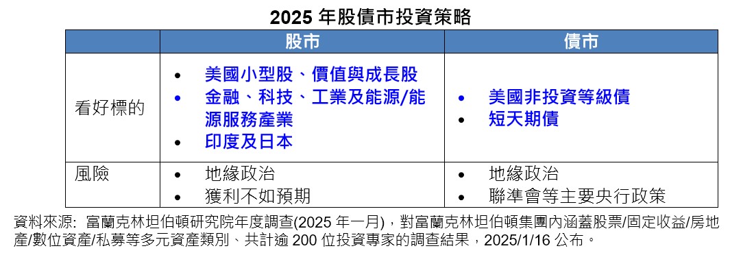 富蘭克林坦伯頓基金集團結合集團內逾200位投資專家見解,發布最新經濟及投資展望調查,預期2025年美股多頭續航,漲勢有望從科技股擴散至其他股票和產業,建議投資人掌握三大主軸: