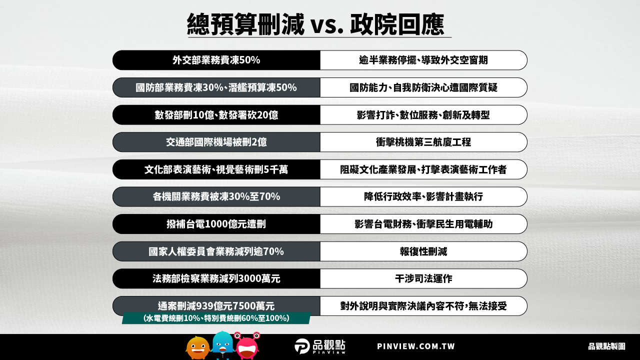 立法院昨(21)日針對今年度中央政府總預算案大砍2075億餘元,由於在野黨佔表決席次優勢,刪減金額為史上最高,約佔今年度支出6.64%,行政院及各部會大動作表達抗議,總統賴清德更在昨晚發文痛批「對政府的影響是史無前例」。實際上究竟刪除、凍結了哪些項目?對民生的影響如何?《品觀點》提供整理如下: