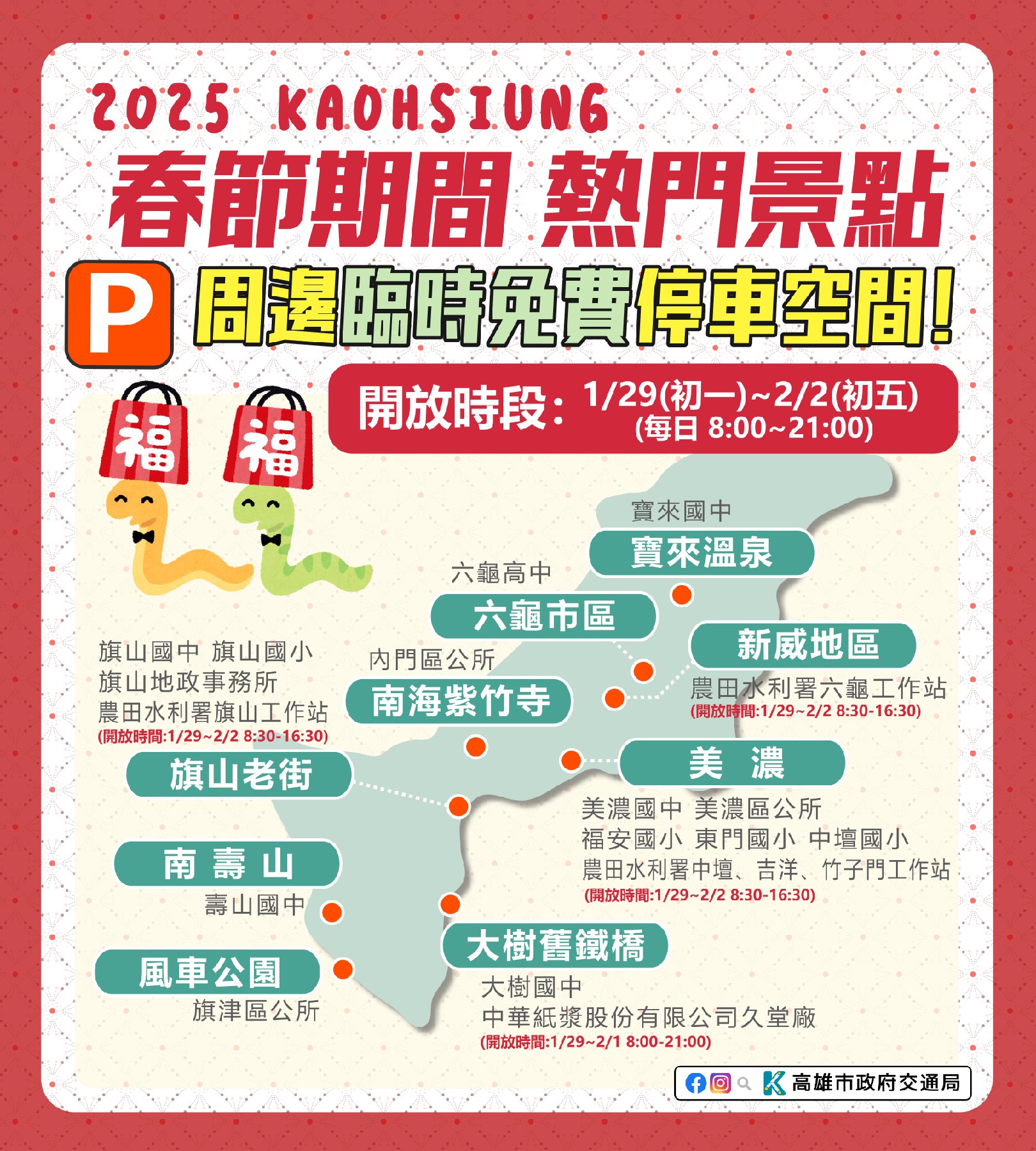 春節9天連假即將到來,高雄市內各大觀光景點,包括旗津、西子灣、哈瑪星、駁二藝術特區、壽山動物園、佛光山、旗山老街、美濃及崗山之眼等地,預計湧入大量遊客。為確保交通順暢,市府將依交通狀況啟動階段性管制措施,特別提醒民眾出行前查詢景點交通資訊及替代道路規劃,並善用大眾運輸工具暢遊高雄。