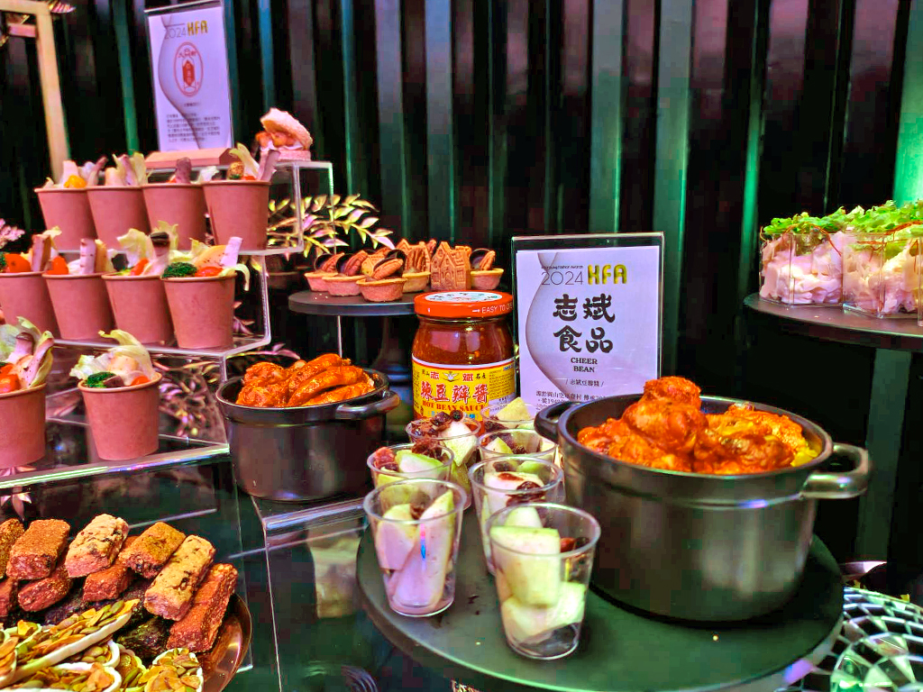 派對現場,以高雄百年品牌與創意美食為核心,為賓客呈現一場別開生面的跨界體驗。傳承百年的「大樹麻油行」以柴燒黑麻油烹調的多汁雞肉串,搭配清新蔬菜杯,釋放濃郁芝麻香氣,讓來賓回味無窮;而擁有70年歷史的「志斌豆瓣醬」,則創新融入法式蕈菇鹹派與美式辣雞翅,碰撞出鹹香交織的全新滋味,展現老字號品牌的時尚詮釋力。