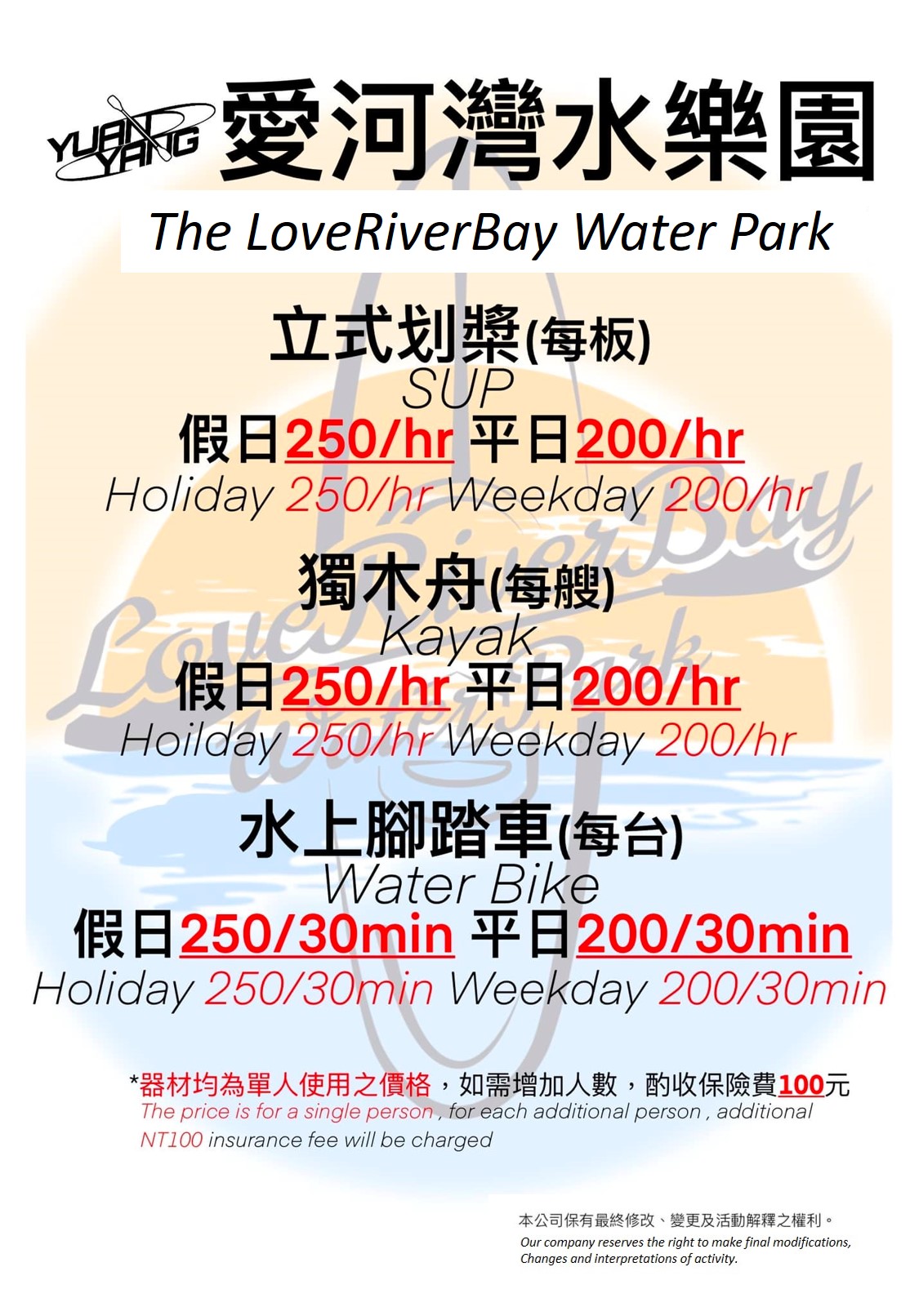 ↑圖說:愛河灣水樂園浮具租賃收費標準(圖片來源:高雄市海洋局提供)