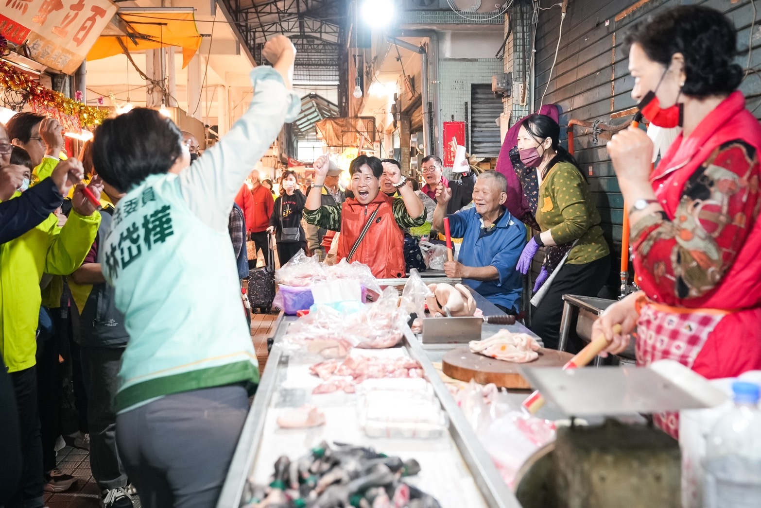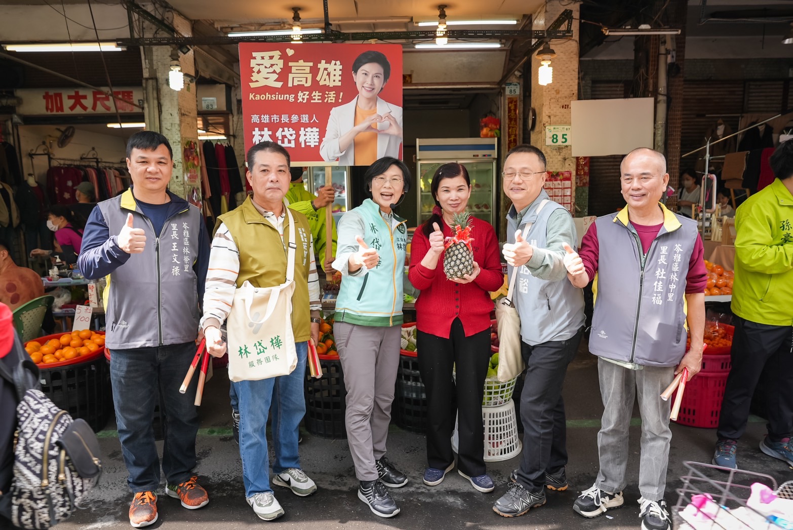 圖說:林岱樺(左三)一行人所到之處受攤商熱情支持。(圖片來源:林岱樺服務團隊提供)