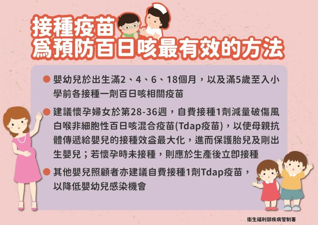 百日咳為呼吸道傳染病,潛伏期一般為5至10天,最長可達21天,主要透過飛沫傳染,初期症狀與感冒類似,民眾可能因忽略症狀延遲就醫,而傳染給家人或其他接觸者, 有疑似症狀(陣發性嚴重咳嗽、呼吸有哮喘聲、咳嗽後臉潮紅或發紫及咳嗽後嘔吐等)應及時就醫與診斷。接種疫苗為預防百日咳最有效方法,目前國內提供嬰幼兒於出生滿2、4、6、18個月,以及滿5歲至入小學前各接種一劑百日咳相關疫苗。