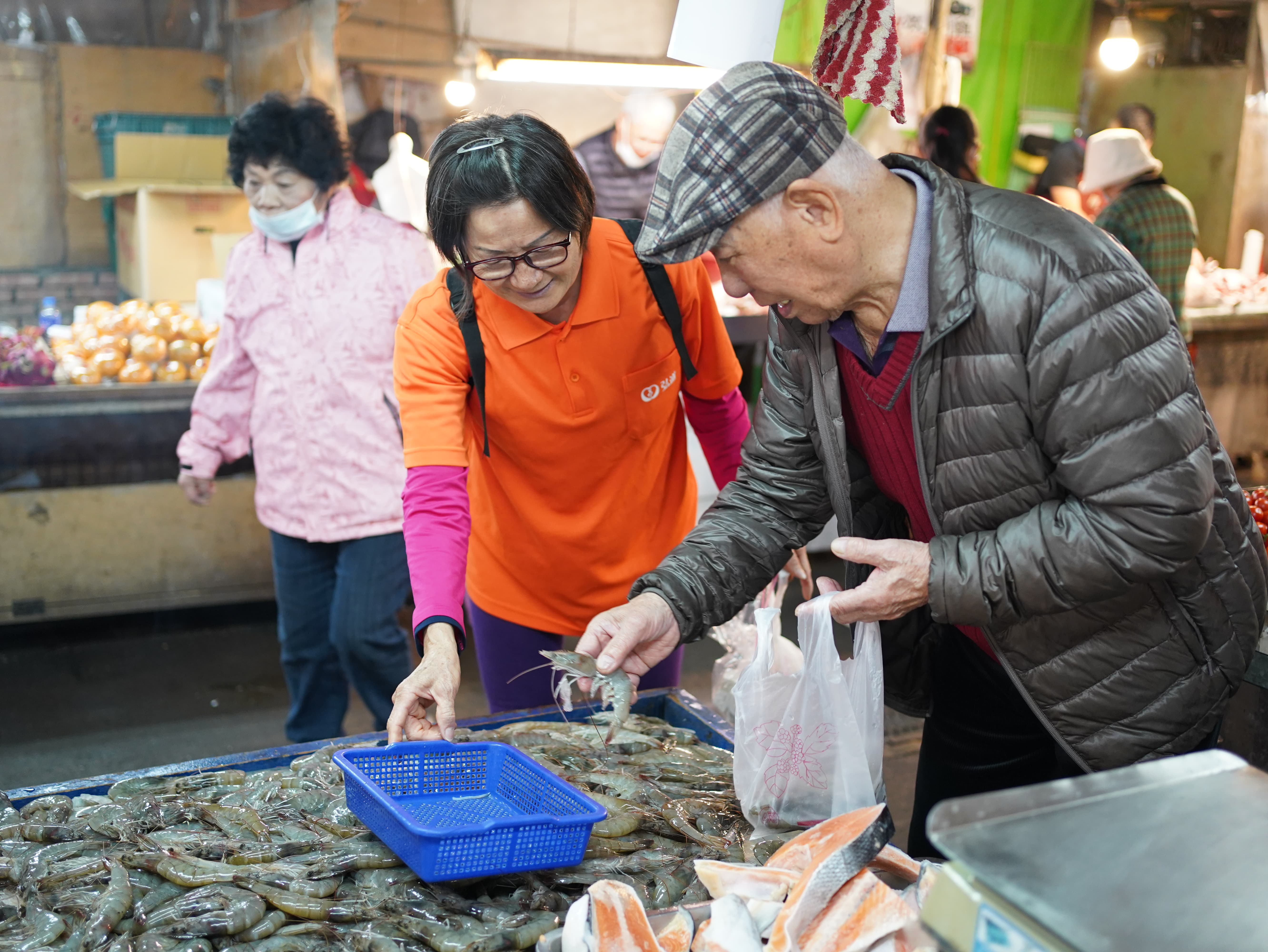 ↑圖說:志工陪伴丁爺爺開心到菜市場採買,爺爺認真挑選食材。(圖片來源:弘道老人福利基金會提供)