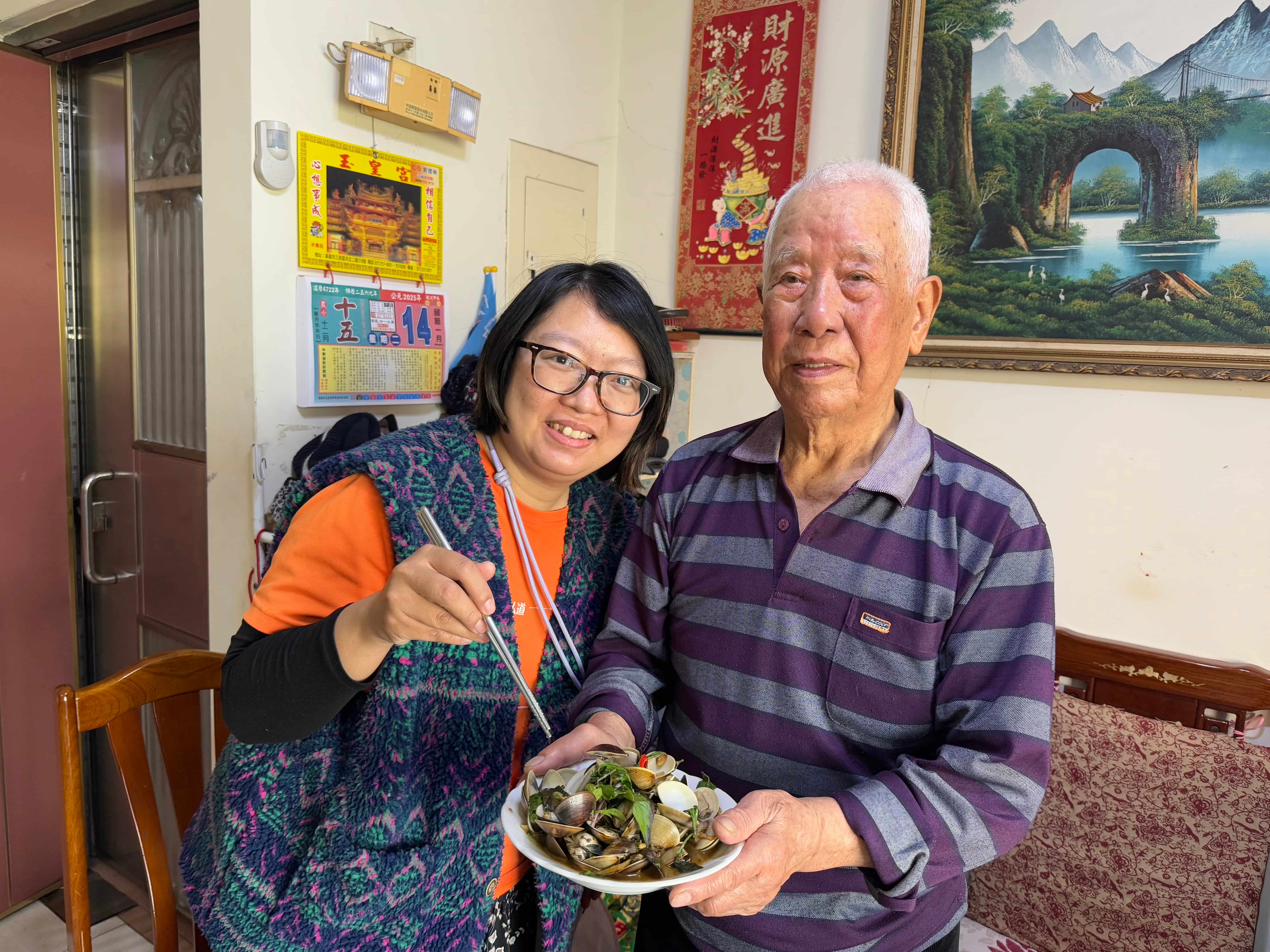 ↑圖說:.丁爺爺完成當年的拿手好菜「九層塔炒蛤蠣」(圖片來源:弘道老人福利基金會提供)